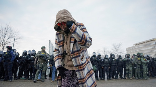 “We’re here to support our Somali neighbors; they asked for their white allies to show up for them,” said Laura, 56, who, like all protesters interviewed, asked that their last name not be used for fear of retribution by the federal government. “I’m here to exercise my First Amendment right because my neighbors can’t, they’re too afraid to leave their house.”